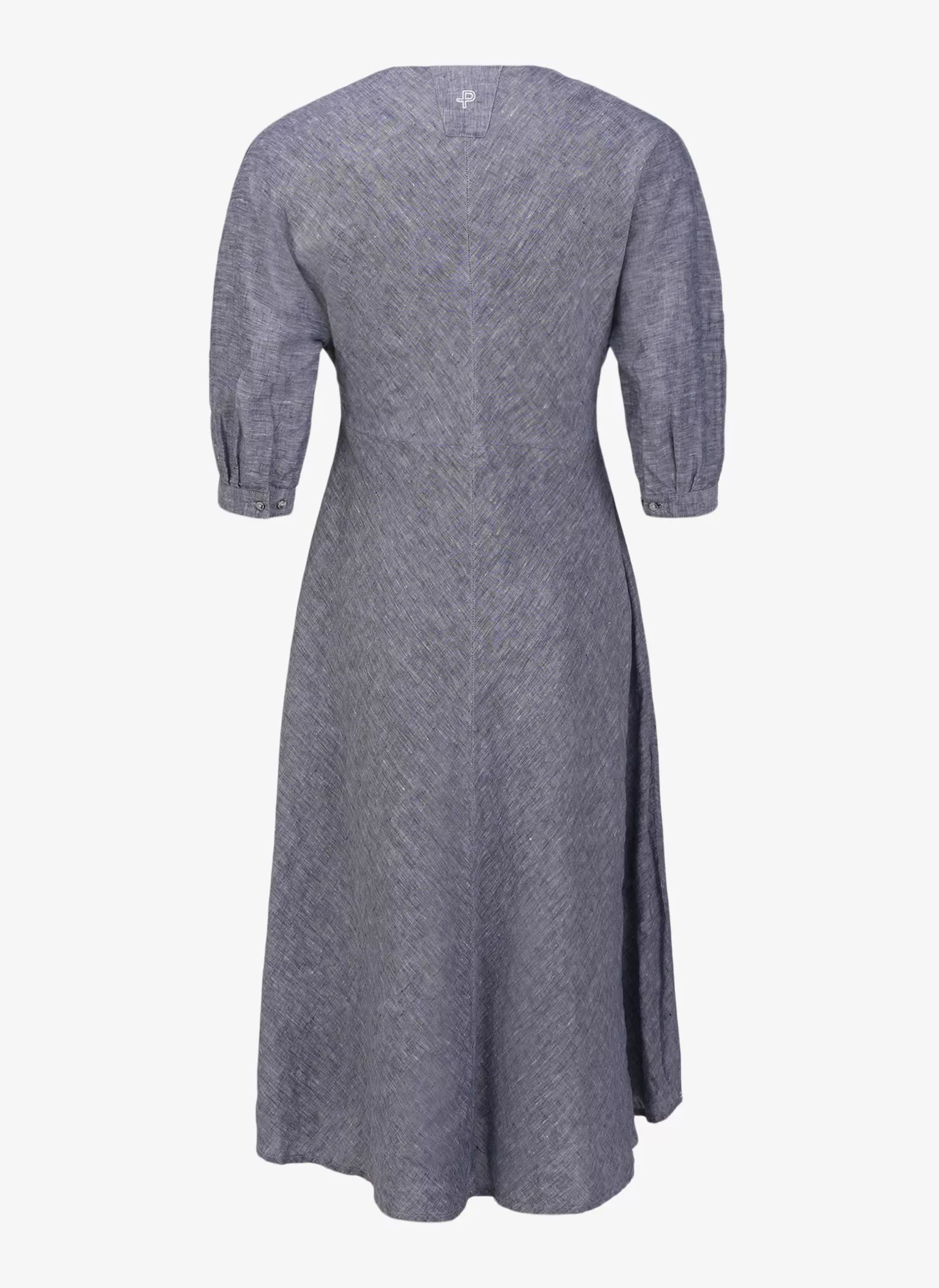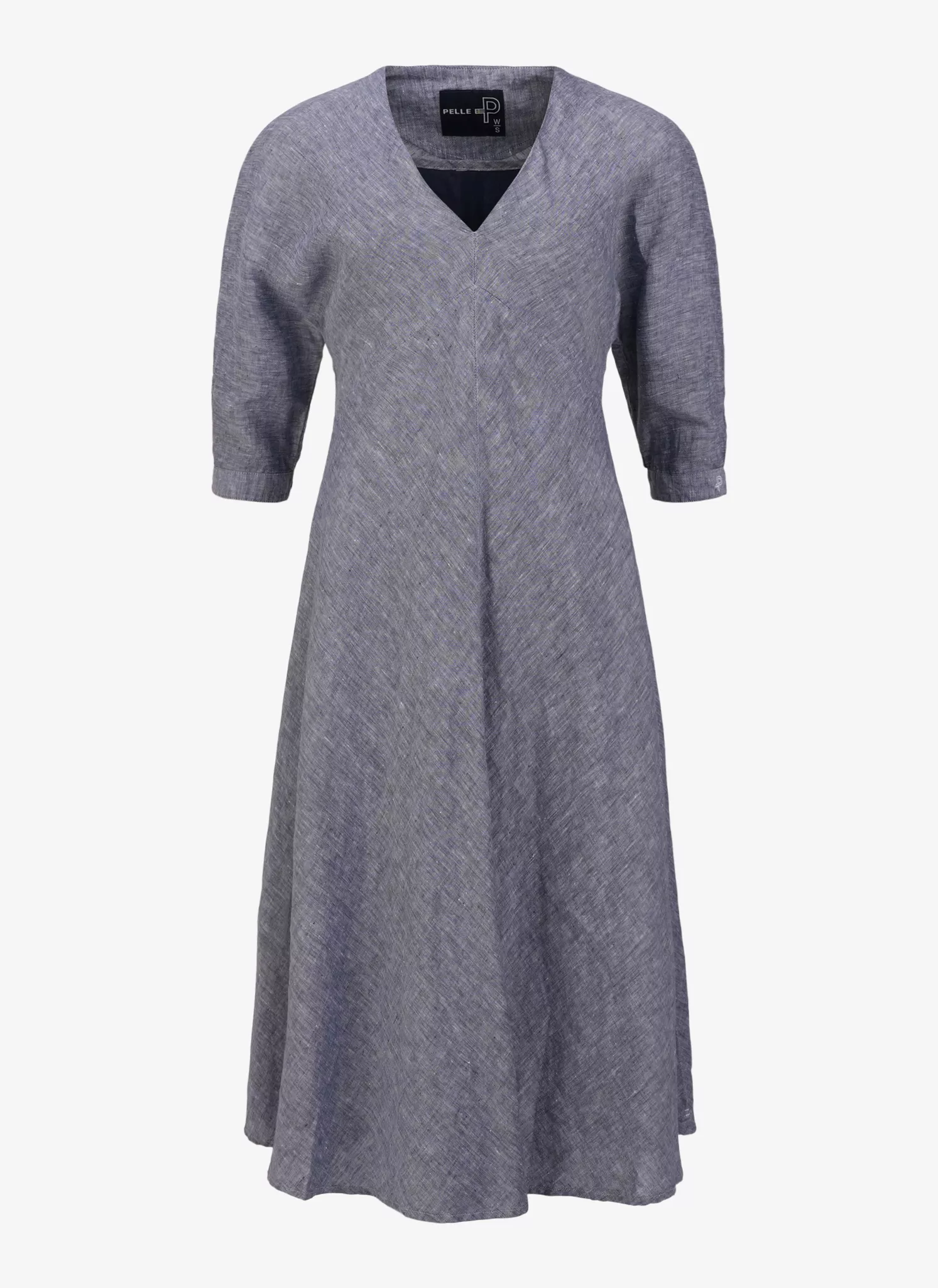 Stiilne ja õhuline linane kleit vaba ja mugava lõikega. Linane kangas on vastupidav, loomulikult funktsionaalne ja ajatu. Linane kleit on  kergesti kantav, sobib erinevate stiilide ja olukordadega. Kleit on avara lõikega, V-kaelusega, mansettidega varrukate ning kellukeselõikelise seelikuga. Kaelusel ja vasakul varrukal P-logo. Kleidi all on eemaldatav aluskleit.